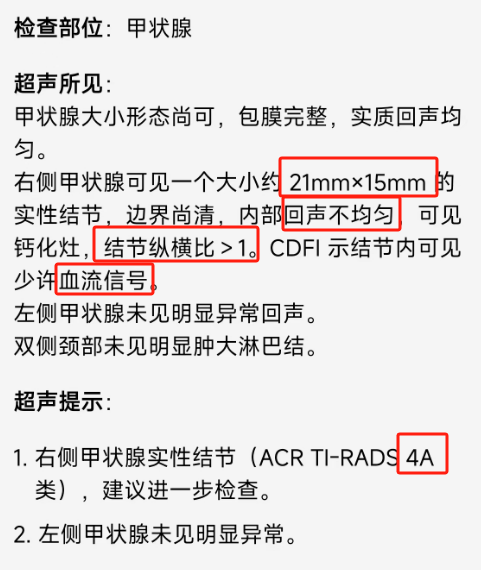 2年后一次洗澡,摸到颈间有个会滑动的硬块,心里咯噔一下,立马去医院做了一个B超,结果4mm的小结节长到了21mm!实质性结节伴钙化!纵横比>1!医生随口一句“你这个恐怕不好,做手术吧”,我彻底恐慌了。