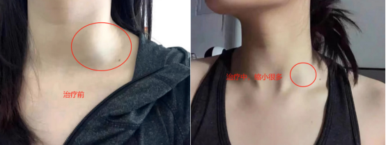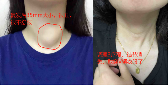 经过1疗程调理结节体积就缩小了42.7%,凸出的疙瘩明显平了,而且血流信号也减少了;第2疗程结束,实性结节大小不到1cm,钙化消失!最让我惊喜的是甲状腺功能检查中,曾经偏高的甲状腺过氧化物酶抗体(TPOAb)竟下降了60%;第3疗程时,脖子完全感觉不到压迫了,大夫主动让我去做个复查,结果原来35mm结节消除了,很高兴的我觉得是在做梦,顺道又做了乳腺检查,长了2年的乳腺结节也没了。我忍不住感慨,中医大夫一药治多病的神奇疗效。