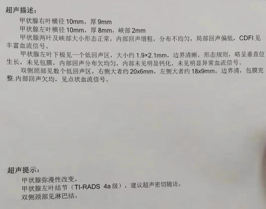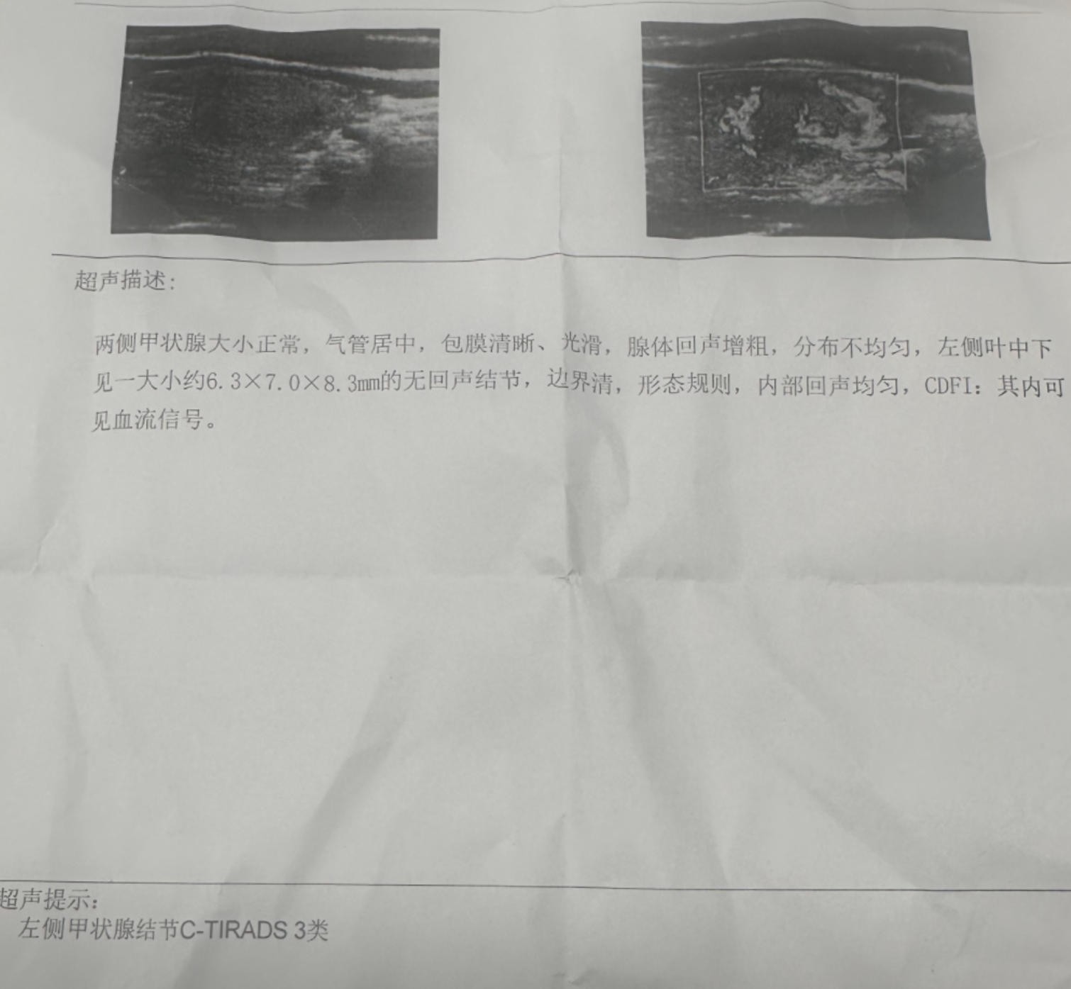 我是一名普通外科的医生,治疗过很多的甲状腺结节,结节伴随肿大的患者,但是我万万没想到有一天这个病会落在我的身上。 大概三年前,单位组织体检的时候检查出甲状腺结节,检查结果显示:左侧叶中下见一大小约6.3x7.0x8.3mm的无回声结节,边界清,形态规则,内部回声均匀,其内可见血流信号,我自己就是专业的外科大夫,一看报告我就知道这个结节没啥大问题,我问了同事,血流信号也不是很大,或许是前段时间我感冒加熬夜导致的炎性改变,确实我没有放在心上,我基本上是啥症状的都没有,在临床上如果我遇到这样的患者,基本是按时随访就可以了,我自己也就没有太重视,现在想想真的悔不当初!