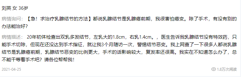 我是乳腺结节患者,我就是吃的微信号:zzrd1810的丸剂治好的,我当时比你厉害些,但现在结节已经完全没了。结节虽然比较难冶,但找到方法就好办。不过千万别干等,我姑姑当时就是乳腺癌切了个乳房,到现在还要定期化疗呢.